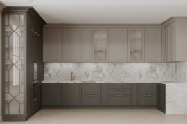 Bucătărie modernă cu mobilier personalizat, realizat din MDF AGT Supramat în nuanțe de gri mat și accente din lemn natural.