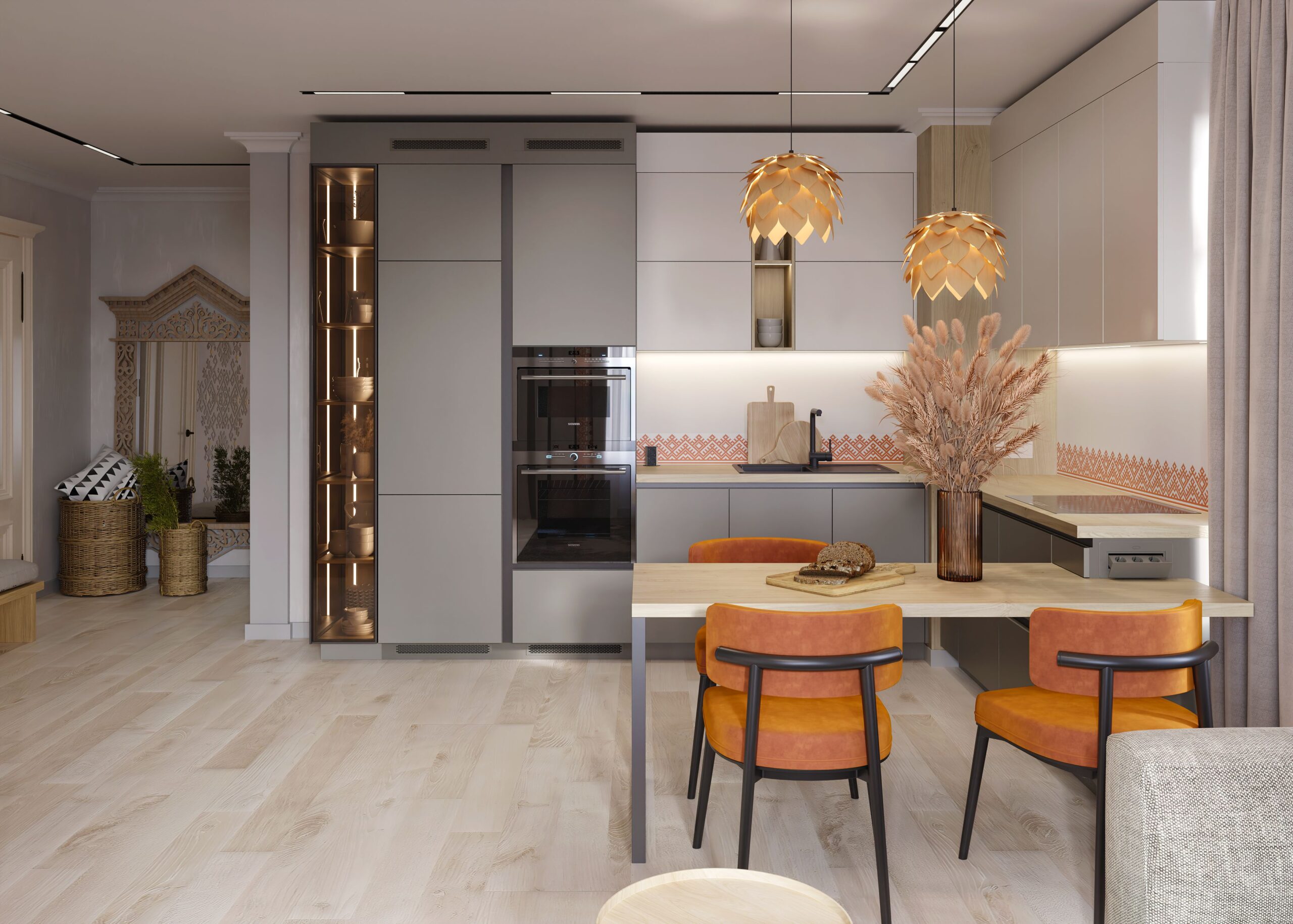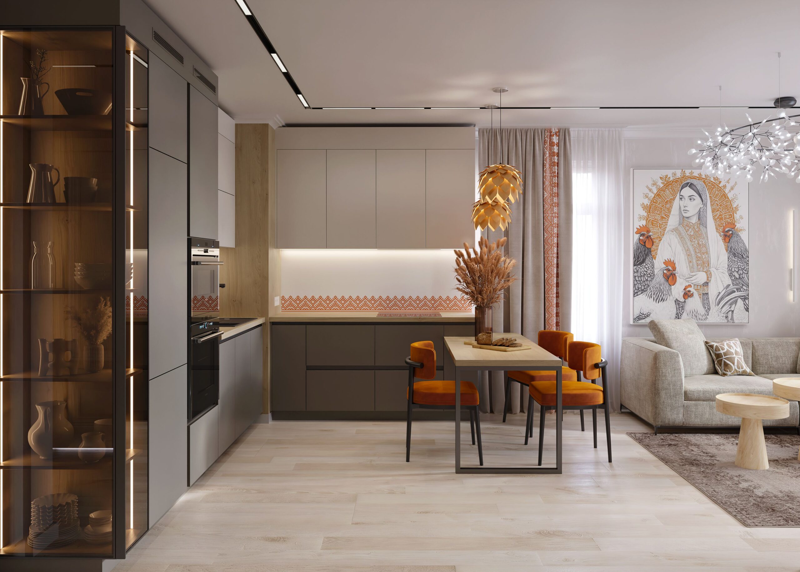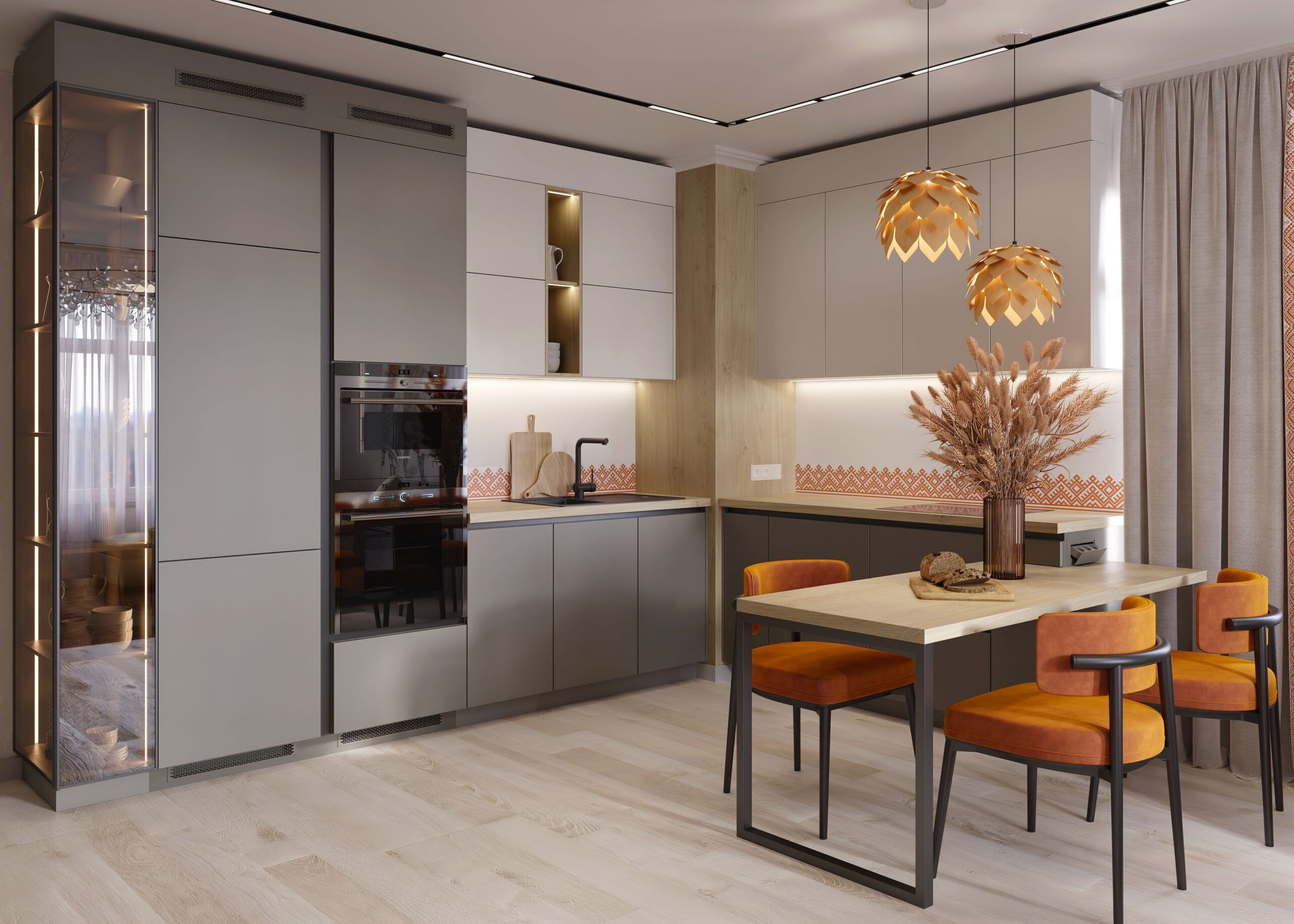Bucătărie modernă cu mobilier personalizat, realizat din MDF AGT Supramat în nuanțe de gri mat și accente din lemn natural. Corpurile suspendate fără mânere oferă un aspect minimalist, iar iluminarea LED integrată sub dulapuri creează un efect elegant. Electrocasnicele încorporate sunt perfect integrate în design, iar vitrina cu sticlă fumurie și iluminare interioară adaugă un plus de rafinament. Masa din lemn masiv, cu picioare metalice negre, este completată de scaune tapițate în catifea portocalie, oferind un contrast cald și primitor.